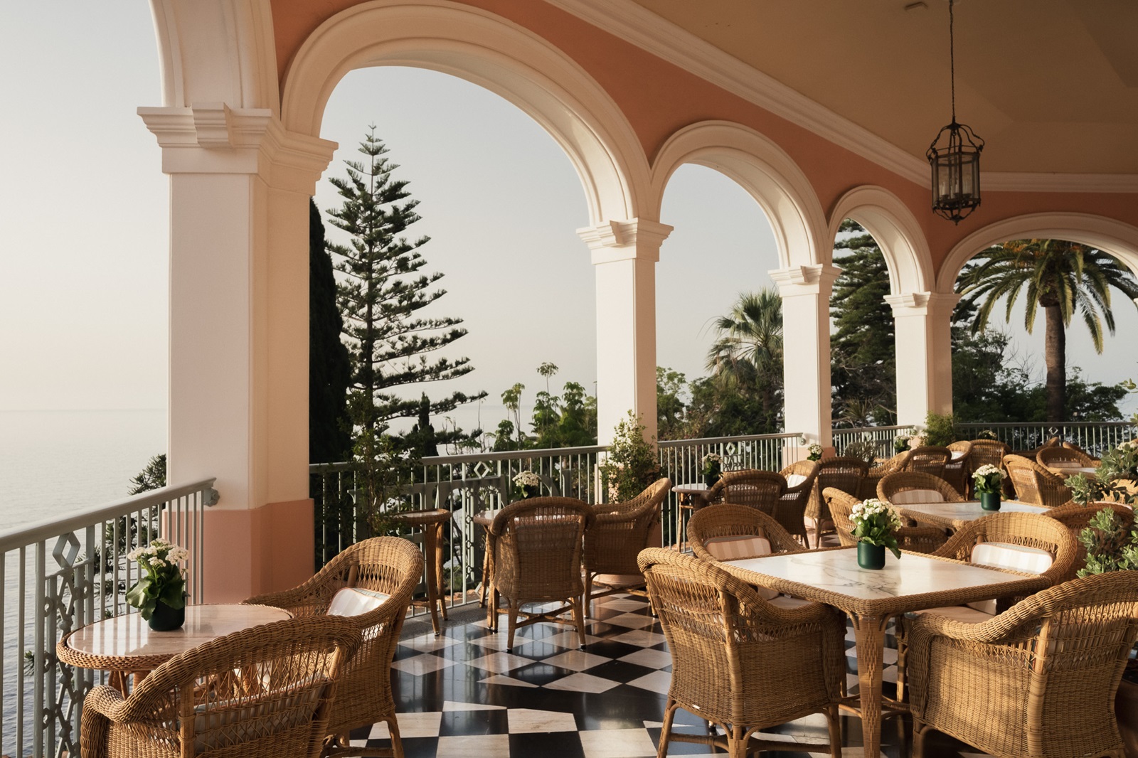 prachtige lobby met zithoeken en terras met panoramische zicht over de tuin en de zee