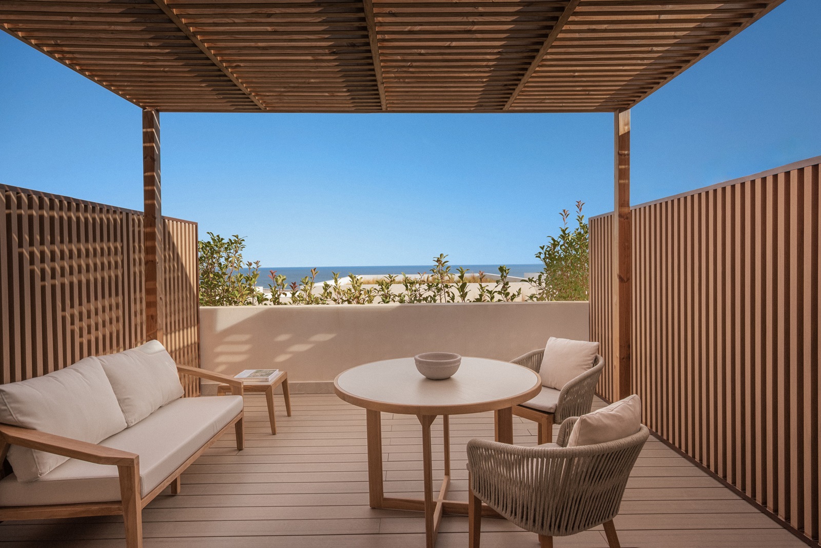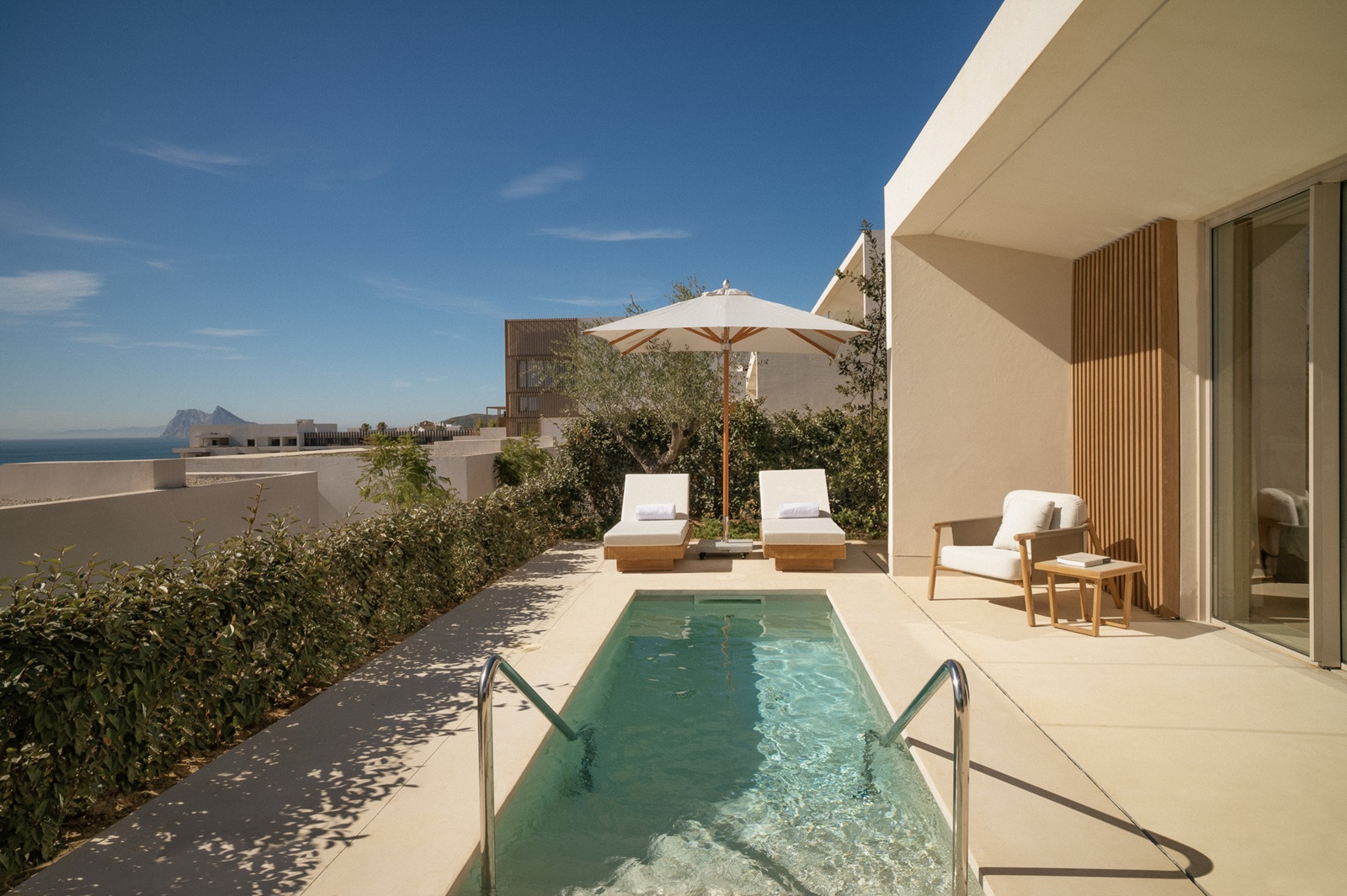 Mediterranean Pool Suite (190 m²) met ruime living, aparte slaapkamer met kingsize bed, terras met ligzetels, plunge pool en zeezicht