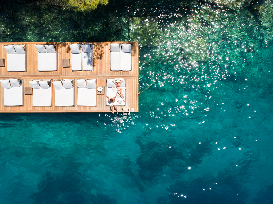 het paradijselijke en rustige ‘Serenity Beach’ (adults only, 65 m) te bereiken via het dennenbos (ook te bereiken per boot) met ‘Serentiy Bar’