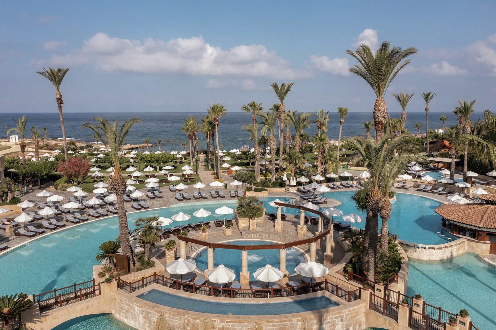 ligbedden, matrasjes, parasols en handdoeken aan de zwembaden en het strand