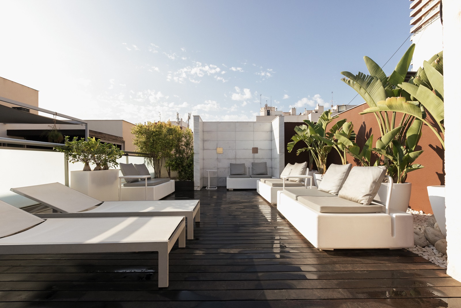 ligbedden en handdoeken op het dakterras