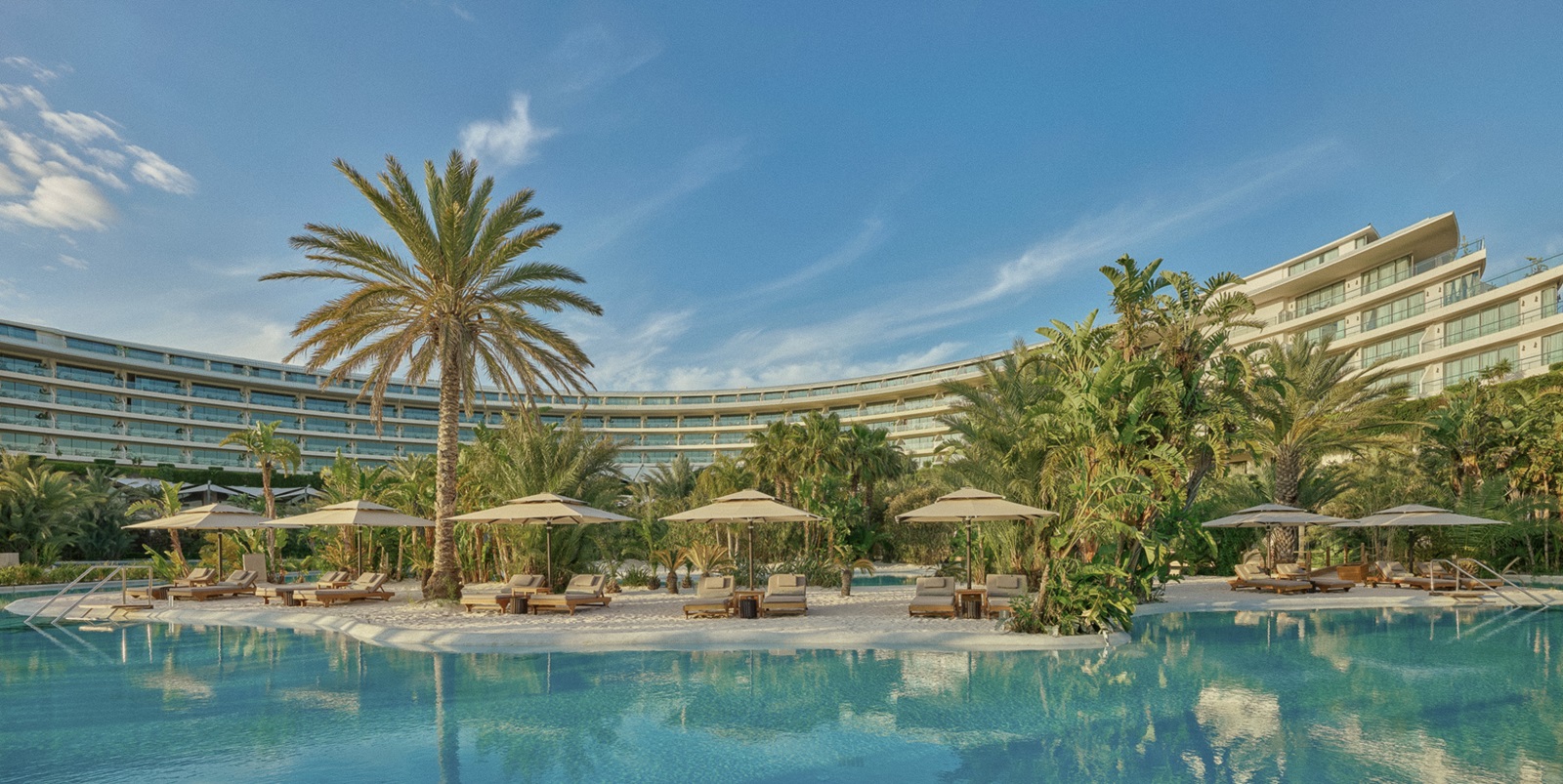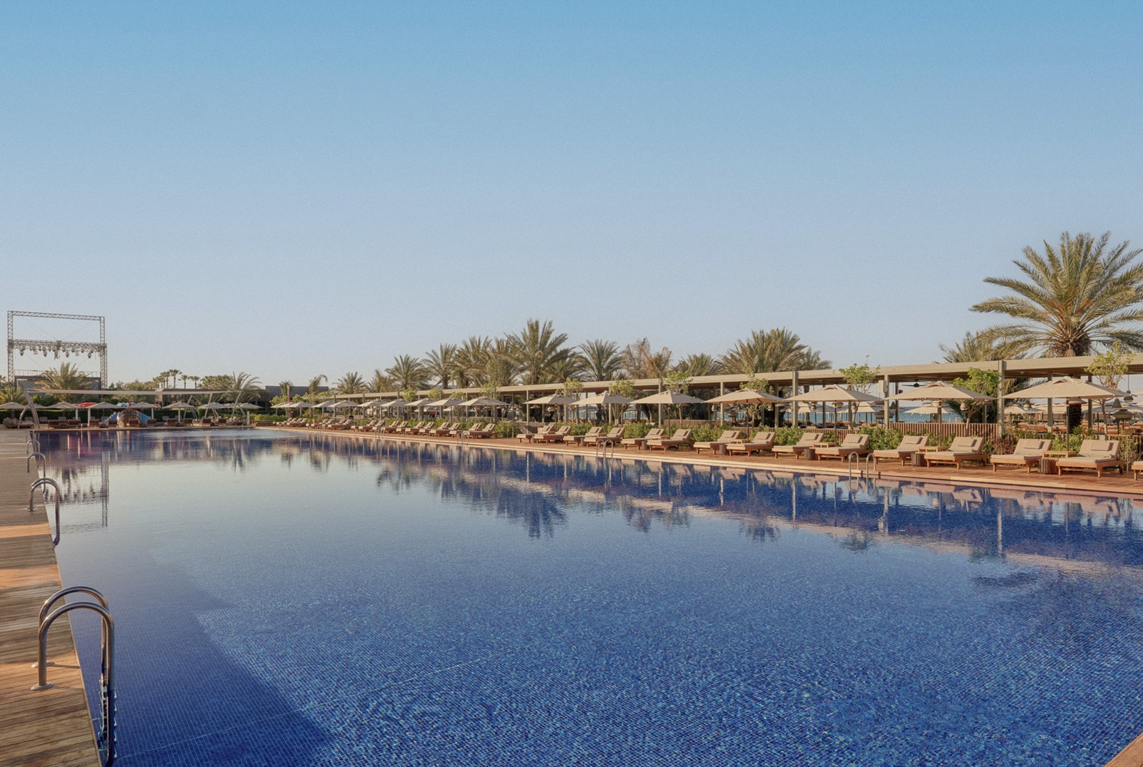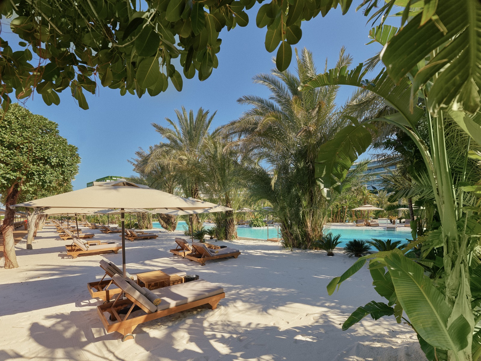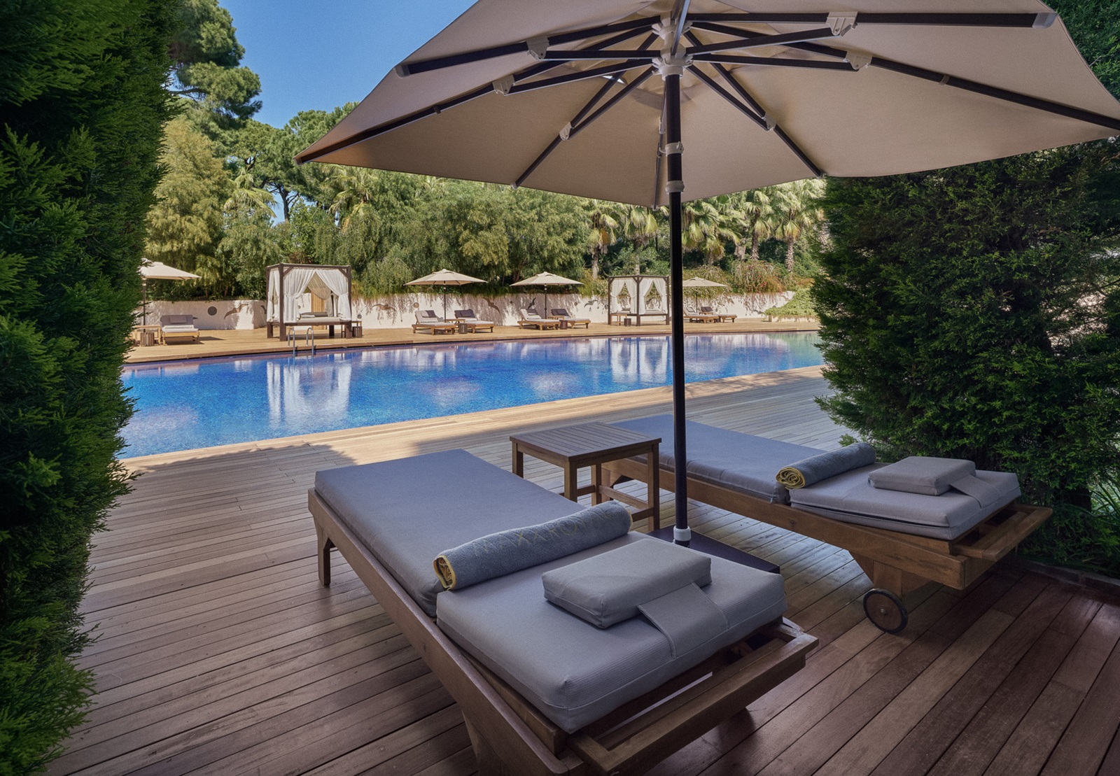 ligbedden, parasols en handdoeken aan het zwembad en aan het strand